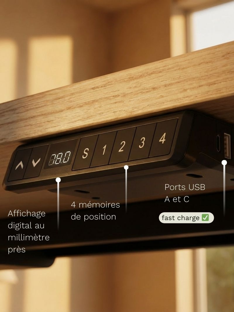 Console de commande : Ecran LCD / 3 hauteurs mémorisables / 1 port USB A / 1 port USB C