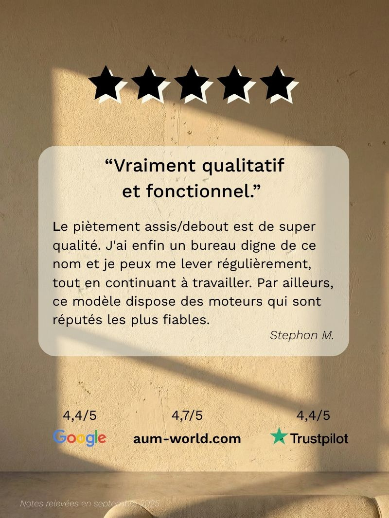 Si vous êtes ici, c’est que vous avez compris qu’un bureau, c’est fait pour bouger. Avec AUM WORLD, le bureau en mouvement® prend tout son sens. Vérifiez simplement que ses hauteurs minimale et maximale s'adaptent parfaitement à votre morphologie.