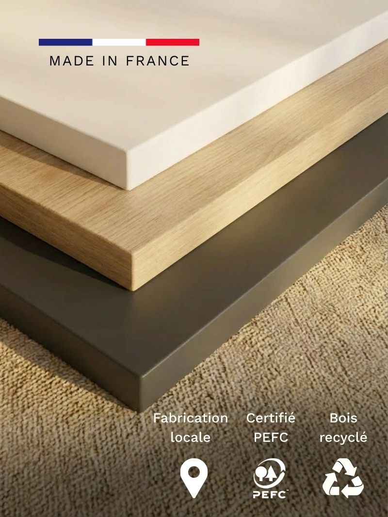 Épaisseur du plateau : 2,5 cm + chants plaqués en ABS 0,2 cm antichocs ainsi que des 1⁄4 de rond de 0,2 cm